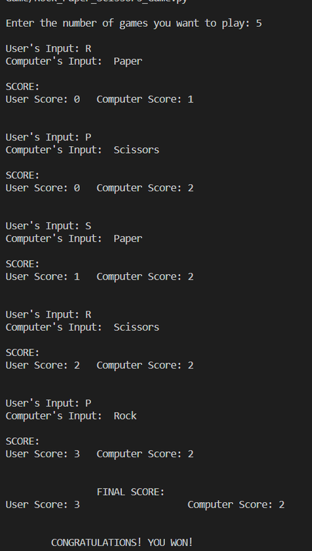 A Simple Rock Paper Scissors Game: To be Played with a Computer. You can enter the number of games you want to play. There is also a score window which is displayed after every turn. Example Game: